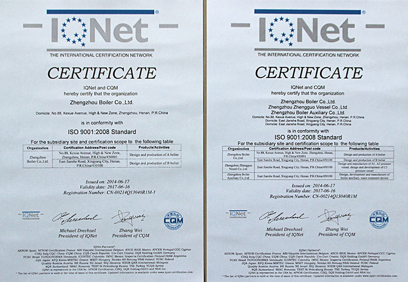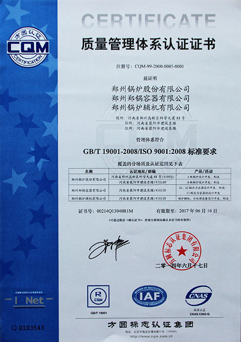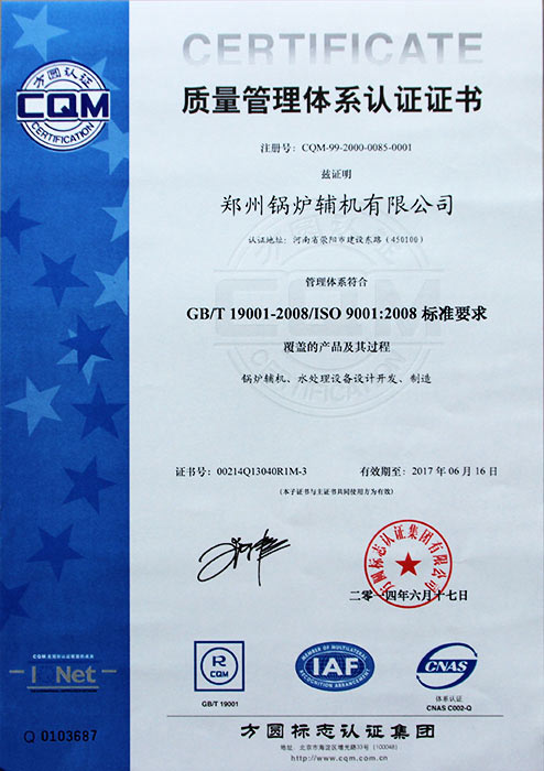 公司于1999年一次通過(guò)ISO9001國(guó)際質(zhì)量體系認(rèn)證,2002年取得國(guó)際認(rèn)證聯(lián)盟質(zhì)量管理認(rèn)證證書(shū),2008年一次通過(guò)美國(guó)機(jī)械工程師協(xié)會(huì)鍋爐及壓力容器ASME認(rèn)證等。