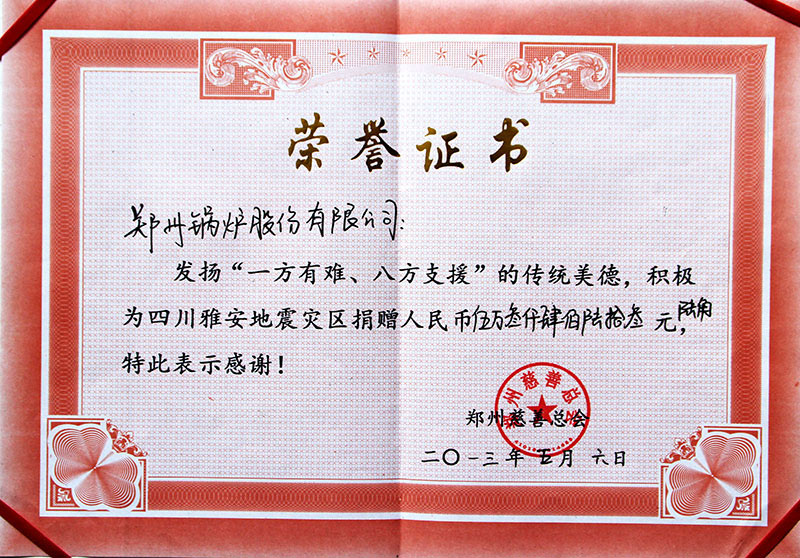近年來,鄭鍋憑借一流的技術、過硬的產品、周到的服務,先后榮獲河南省高新技術企業(yè)、管理先進單位、鄭州市高成長性民營企業(yè)、鄭州市百強企業(yè)、五一勞動獎等多項榮譽。