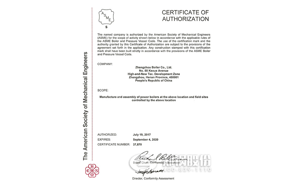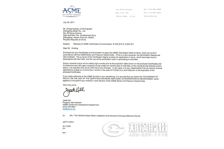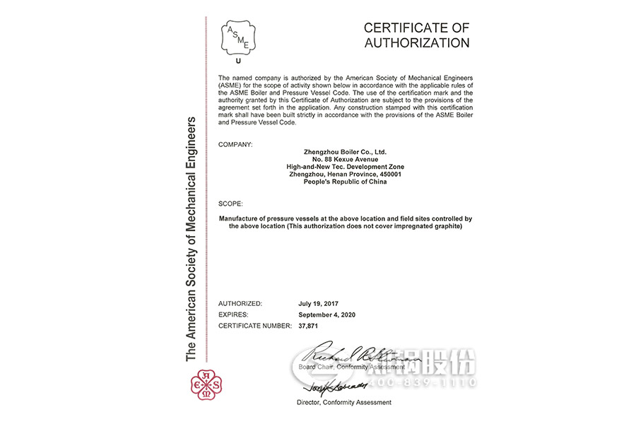 2017年7月,鄭鍋股份順利通過(guò)了ASME換證聯(lián)檢評(píng)審。聯(lián)檢組專家對(duì)鄭鍋股份進(jìn)行了深入細(xì)致的評(píng)審后認(rèn)為公司執(zhí)行標(biāo)準(zhǔn)情況符合ASME要求,準(zhǔn)許換證。日前,美國(guó)機(jī)械工程師協(xié)會(huì)已向鄭鍋頒發(fā)新的ASME鋼印和授權(quán)證書,有效期自2017年7月19日至2020年9月4日。